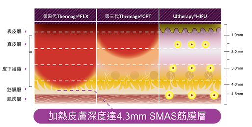 加熱皮膚深度達4.3mm SMAS筋膜層,刺激膠原蛋白增生,療程節省高達25%時間。